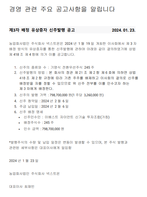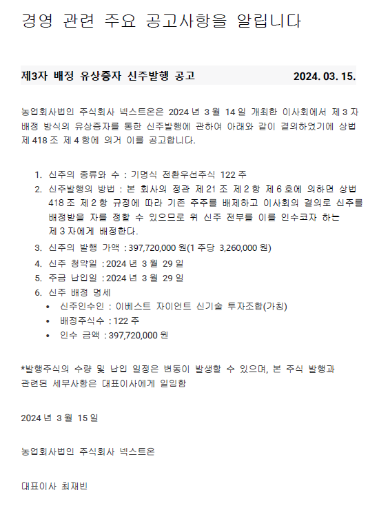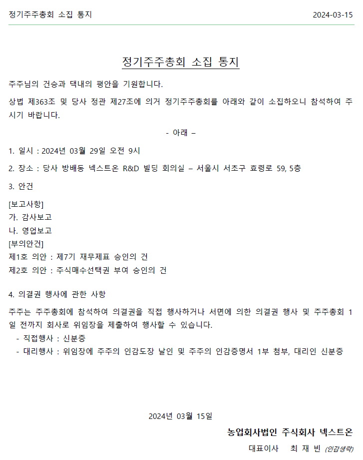 READ MORE 2025-06-19임시주주총회 소집통지 주주님의 건승과 댁내의 평안을 기원합니다. 우리 회사는 상법 365조와 당사 정관 제27조에 의하여 제9기 임시주주총회를 아래와 같이 소집하오니 참석하여 주시기 바랍니다. 또한, 의결권 있는 발행 주식총수의 100분의 1이하의 주식을 소유한 소액주주에 대해서는 상법 제542조의4에 의거 본 공고로 소집 통지를 갈음하오니 이 점 양지하여 주시기 바랍니다. 1. 일시 : 2025년 6월 23일(월) 오전 10시 2. 장소 : 서울시 서초구 효령로 59, NEXTON R&D센터 대회의실(4층) 3. 목적 사항 가. 부의안건 제1호 의안 : 사외이사 선임 건 후보자 명단 성명 생년월일 사외이사 후보자여부 감사위원회 위원인 이사분리선출 여부 최대주주와의 관계 추천인 정용수 1970-05-06 사외이사 부 관계없음 이사회 4. 주주총회 참석시 준비물 가. 직접행사 : 신분증 나. 대리행사 : 위임장 (주주와 대리인의 인적사항 기재, 인감 날인) 원본, 참석장, 주주..